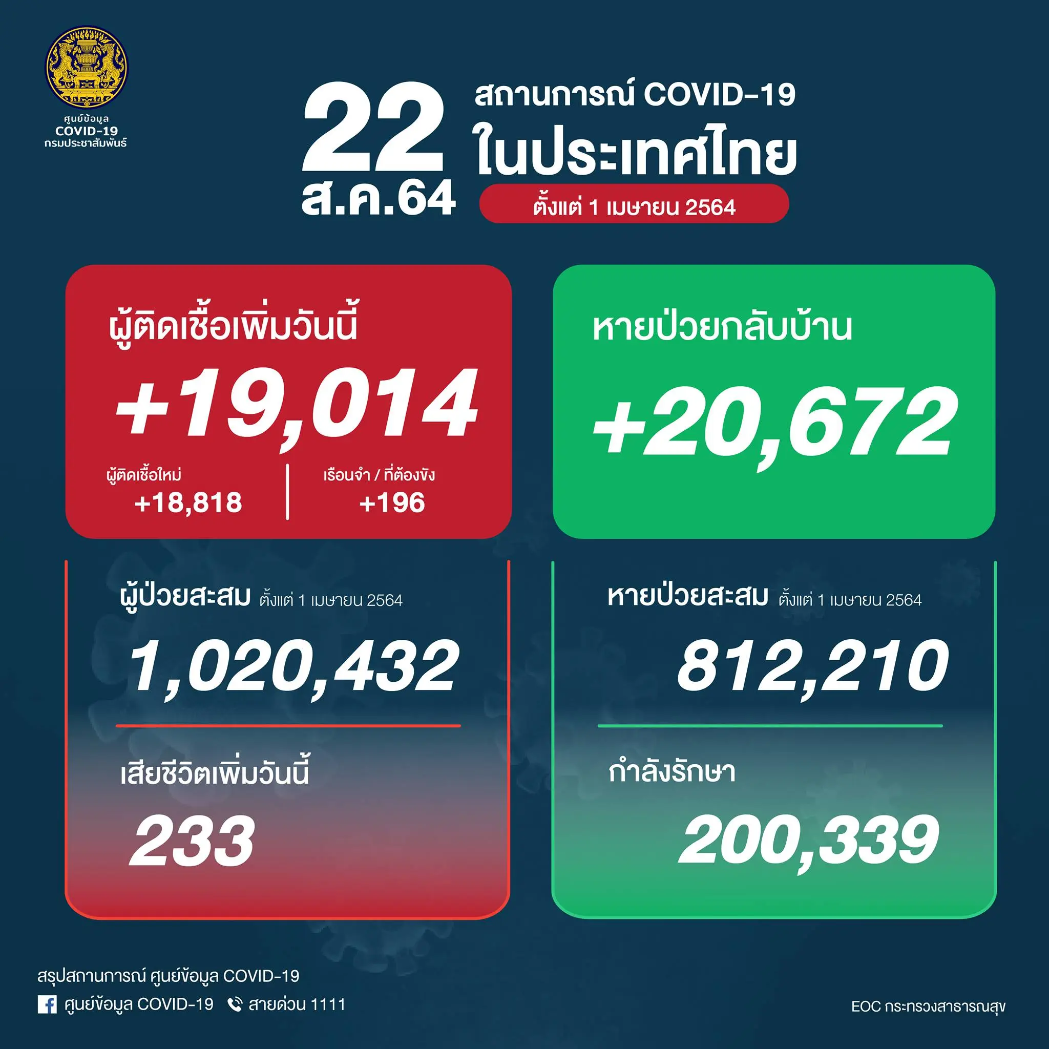 โควิดวันนี้ — เมื่อวันที่ 22 สิงหาคม 2564 ศูนย์ข้อมูล COVID-19 รายงานยอดผู้ติดเชื้อ โควิด-19 โดยพบผู้ติดเชื้อรายใหม่เพิ่ม 18,818 ราย เสียชีวิต 233 ราย ทำให้การระบาดโควิด19 ระลอกใหม่ตั้งแต่เดือนเมษายน 2564 มียอดผู้เสียชีวิตรวม 9,226 ราย และยอดผู้เสียชีวิตสะสมจากการแพร่ระบาดของโควิด19 ตั้งแต่ปี 63 มีทั้งหมด 9,320 ราย สำหรับวันนี้มีรายงานผู้ติดเชื้อจากเรือนจำทั้งหมด 196 ราย รวมจำนวนผู้ติดเชื้อรายใหม่วันนี้ทั้งสิ้น 19,014 ราย
