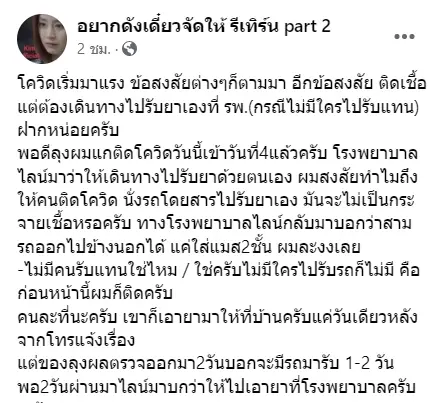 โดยทางเพจระบุข้อความว่า โควิดเริ่มมาแรง ข้อสงสัยต่างๆก็ตามมา อีกข้อสงสัย ติดเชื้อแต่ต้องเดินทางไปรับยาเองที่ รพ.(กรณีไม่มีใครไปรับแทน) ฝากหน่อยครับ