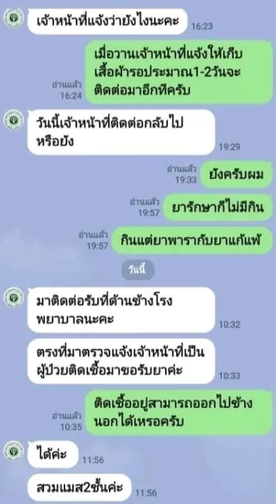 -ไม่มีคนรับแทนใช่ไหม / ใช่ครับไม่มีใครไปรับรถก็ไม่มี คือก่อนหน้านี้ผมก็ติดครับ คนละที่นะครับ เขาก็เอายามาให้ที่บ้านครับแค่วันเดียวหลังจากโทรแจ้งเรื่อง แต่ของลุงผลตรวจออกมา2วันบอกจะมีรถมารับ 1-2 วัน พอ2วันผ่านมาไลน์มาบกว่าให้ไปเอายาที่โรงพยาบาลครับ