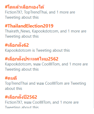 จากการสังเกตเทรนด์ในทวิตเตอร์เห็นได้ชัดเจนเลยว่าแฮชแท็กเกี่ยวกับการเลือกตั้งมาแรงสุด ๆ ไม่ว่าจะเป็น #โตแล้วเลือกเองได้ #ThailandElection2019 รวมถึง #เลือกตั้ง62 ที่ติดอันดับต้น ๆ เพียงชั่วข้ามคืน โดนเมื่อกดเข้าไปดูตามแฮชแท็กเหล่านี้ จะเห็นได้ทุโพสต์นั้นพร้อมมาก ๆ สำหรับการเลือกตั้งครั้งนี้