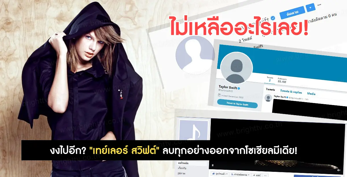 แฟนคลับนักร้องดัง “Taylor Swift” ถึงกับงง! เมื่อสื่อโซเชียลมีเดีย อาทิเช่น เฟซบุ๊ก, อินสตาแกรม, ทวิตเตอร์ ของสาวเทย์เลอร์ สวิฟต์ ลบรูปภาพและคลิปวีดีโอทั้งหมดออกจากโซเชียลหมดเกลี้ยง เหลือไว้แต่ความว่างเปล่า ขนาดรูปโปรไฟล์ยังลบเลย โอ๊ย งงไปอีก