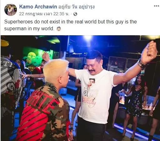 โดยกาโม่ได้โพสต์ข้อความเชิดชูคุณพ่อเป็นภาษาอังกฤษผ่านทางเฟซบุ๊กว่า “Superheroes do not exist in the real world but this guy is the superman in my world.