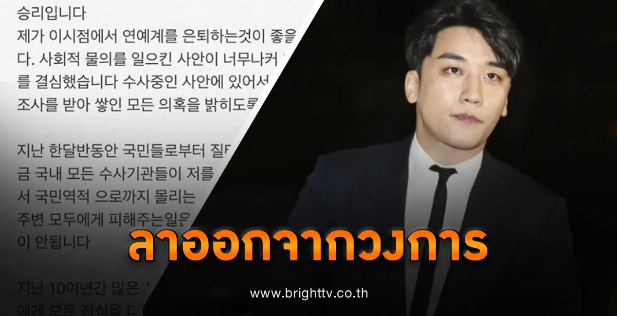 “ซึงรี” ศิลปินชื่อดังของวงการเกาหลี สมาชิก วง BIGBANG ประกาศลาออกจากวงการบันเทิงของเกาหลีใต้แล้วหลังจากมีประเด็นความเกี่ยวพันกับคดีความต่างๆมากมาย