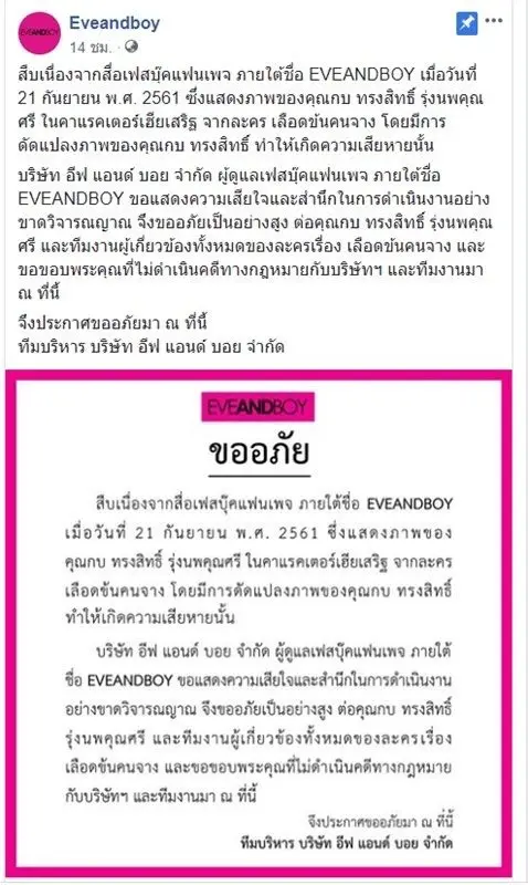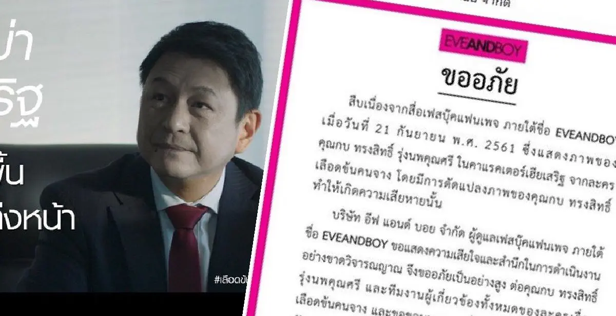 ทีมงานอีฟแอนด์บอย ออกมายอมรับ พร้อมขอโทษนักแสดงและ กบ ทรงสิทธิ์จากละครเลือดข้นคนจาง เกิดจากการล้อเล่นการแต่งหนาที่สนุกเกินเหตุ