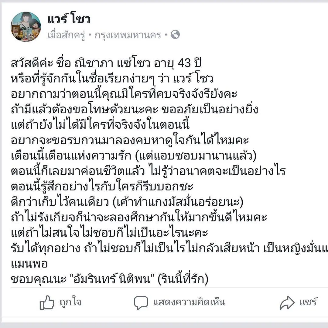 “อ่ำ อัมรินทร์“ ไลฟ์สดเคลียร์ประเด็นที่คุณแม่เลี้ยงเดี่ยว “แวร์ โซว” บอกชอบผ่านเฟซบุ๊ก เจ้าตัวบอกขอบคุณที่มีความรู้สึกดีดีให้ แต่ตอนนี้ตนไม่ได้คิดถึงเรื่องนี้เลย เพราะมีความสุขกับการอยู่กับตัวเองและแก้ไขสิ่งที่ผิดพลาด