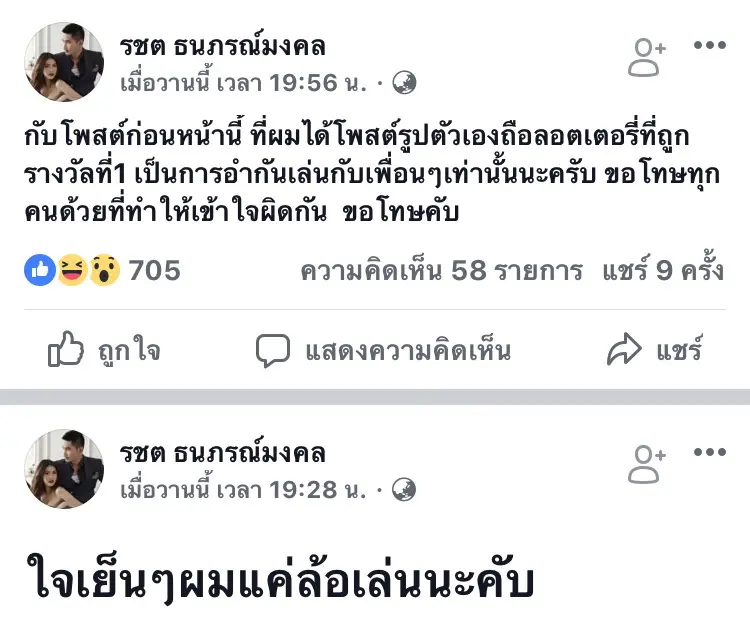 อยู่ๆก็กลายเป็นเศรษฐีคนใหม่ทันทีหลังจากที่ อดีตนักกีฬาฟุตบอลทีมชาติไทย “รชต ธนภรณ์มงคล” หรือสามีหนุ่มของนักแสดงสาวดีกรีมิสยูนิเวิร์ส ไทยแลนด์ “แก้ม กวินตรา” โพสต์ภาพตนเองคู่กับสลากลอตเตอรี่ หมายเลข 739229 ซึ่งเป็นสลากรางวัลที่ 1 ประจำงวดวันที่ 16 เมษายน 2561 ที่มีรางวัลมูลค่าถึง 24 ล้านบาท! แต่แล้วแฟนๆก็ร่วมแสดงความยินดีได้ไม่นาน หนุ่มรชตก็ออกมาโพสต์เฟซบุ๊กส่วนตัว เผยว่า “โพสต์ก่อนหน้านี้ ที่ผมได้โพสต์รูปตัวเองถือลอตเตอรี่ที่ถูกรางวัลที่1 เป็นการอำกันเล่นกับเพื่อนๆเท่านั้นนะครับ ขอโทษทุกคนด้วยที่ทำให้เข้าใจผิดกัน ขอโทษครับ”  รวมไปถึงสาวแก้มก็ออกมาโพสต์ยืนยันอีกคนว่าไม่ได้ถูกลอตเตอรี่จริงๆ