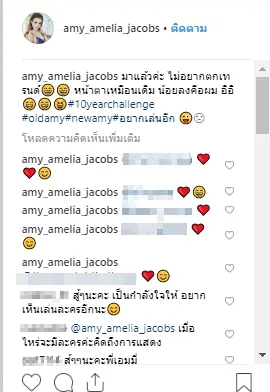 หลังจาก “เอมี่ อาเมเรีย จาคอป” อดีตนางเอกละครดัง วลีฮิต “แม่มา” ที่เคยมีข่าวเกี่ยวข้องกับยาเสพติดร่วมกับแฟนหนุ่ม ภายหลังจากการถูกควบคุมให้เข้าเรือนจำพ้นโทษออกมาแล้ว เจ้าตัวขอนุ่งขาว ละทางโลก โกนผมบวชชี ทนแทนพระคุณพ่อแม่และอุทิศส่วนบุญส่วนกุศล ให้เจ้ากรรมนายเวร ที่ศูนย์ปฏิบัติธรรมแห่งหนึ่งในจังหวัดปราจีนบุรี ล่าสุดเจ้าตัวเคลื่อนไหวอีกครั้ง พร้อมโพสต์ภาพผ่านอินตาแกรมส่วนตัวตามเทรนด์ฮิตในตอนนี้ #10yearchallenge โดยให้แคปชั่นในภาพว่า “มาแล้วค่ะ ไม่อยากตกเทรนด์ หน้าตาเหมือนเดิม น้อยลงคือผม อิอิ#10yearchallenge #oldamy#newamy#อยากเล่นอีก ” ทางด้านเหล่าแฟนคลับรีบเข้าไปคอมเมนต์ถามเมื่อไหร่จะกลับมาเล่นละครอีก อยากจะเห็นผลงานของเธออีกครั้ง