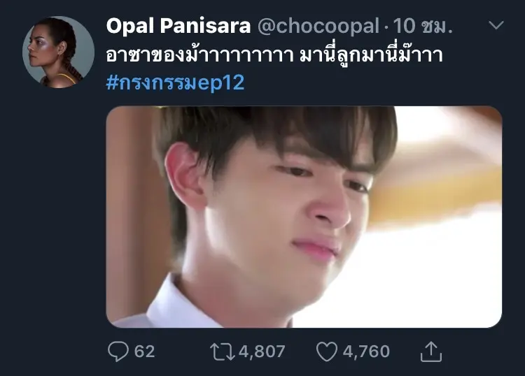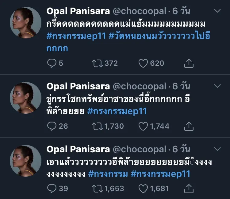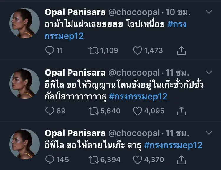 ดำเนินมาถึงตอนที่ 12 แล้วและทวีคูณเข้มข้นขึ้นเรื่อยๆ สำหรับละครน้ำดีแห่งปี กรงกรรม ที่นอกจากจะส่งให้เรตติ้งพุ่งทะยานอย่างไม่หยุดแล้วยังส่งให้เหล่านักแสดงกลายเป็นที่รู้จักมากกว่าเดิม ทั้งนี้ยังทำให้ผู้ชมเกิดอาการคันไม้คันมืออยากจะสวมวิญญาณเป็นเรณู (รับบทโดยเบลล่า ราณี) กระชากตัวร้ายน่าหมั่นไส้อย่างพิไล (รับบทโดยแพร์ พิชชาภา) มาตบๆๆๆ แต่ก็ทำได้เพียงบ่นลงโลกโซเชียลกันชนิดที่อินหนักมาก ซึ่งหนึ่งในคนที่อินหนักถึงขั้นเคลียร์คิวว่างเพราะอยากจะจ้องหน้าจอรอดูละครนั้นก็คงหนีไม่พ้นแม่บ้านสายละครได้อย่าง “โอปอลล์ ปาณิสรา” ที่ขยันทวิตข้อความ พร้อมตบเสมือนเป็นแม่เรณูซะเองเลยจ้า