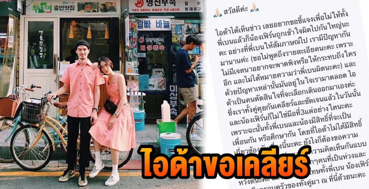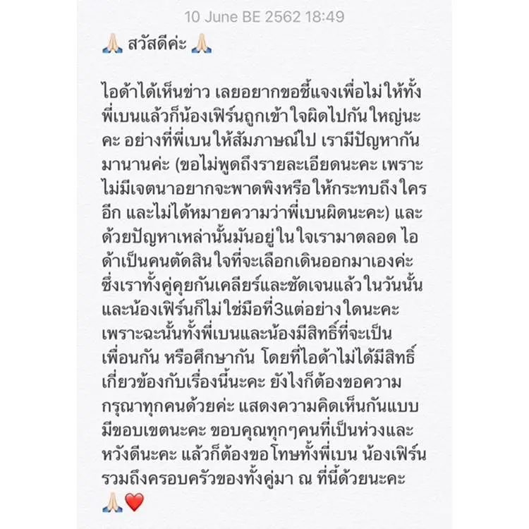 ‘สวัสดีค่ะ ไอด้าได้เห็นข่าว เลยอยากขอชี้แจงเพื่อไม่ให้ทั้งพี่เบ็นแล้วก็น้องเฟิร์นถูกเข้าใจผิดไปกันใหญ่นะคะ อย่างที่พี่เบ็นให้สัมภาษณ์ไป เรามีปัญหากันมานานค่ะ (ขอไม่พูดถึงรายละเอียดนะคะ เพราะไม่มีเจตนาอยากจะพาดพิงหรือให้กระทบถึงใครอีก และไม่ได้หมายความว่าพี่เบ็นผิดนะคะ) และด้วยปัญหาเหล่านั้นมันอยู่ในใจเรามาตลอด ไอด้าเป็นคนตัดสินใจจะเลือกเดินออกมาเองค่ะ ซึ่งเราทั้งคู่คุยกันเคลียร์และชัดเจนแล้วในวันนั้น และน้องเฟิร์นก็ไม่ใช่มือที่สามแต่อย่างใดนะคะ เพราะฉะนั้นทั้งพี่เบนและน้องมีสิทธิ์ที่จะเป็นเพื่อนกัน หรือศึกษากัน โดยที่ไอด้าไม่ได้มีสิทธิ์เกี่ยวข้องกับเรื่องนี้นะคะ ยังไงก็ต้องขอความกรุณาทุกคนด้วยค่ะ แสดงความคิดเห็นกันแบบมีขอบเขตนะคะ ขอบคุณทุก ๆ คนที่เป็นห่วงและหวังดีนะคะ แล้วก็ต้องขอโทษทั้งพี่เบน น้องเฟิรี์น รวมถึงครอบครัวของทั้งคู่มา ณ ที่นี้ด้วยนะคะ’
