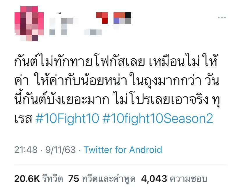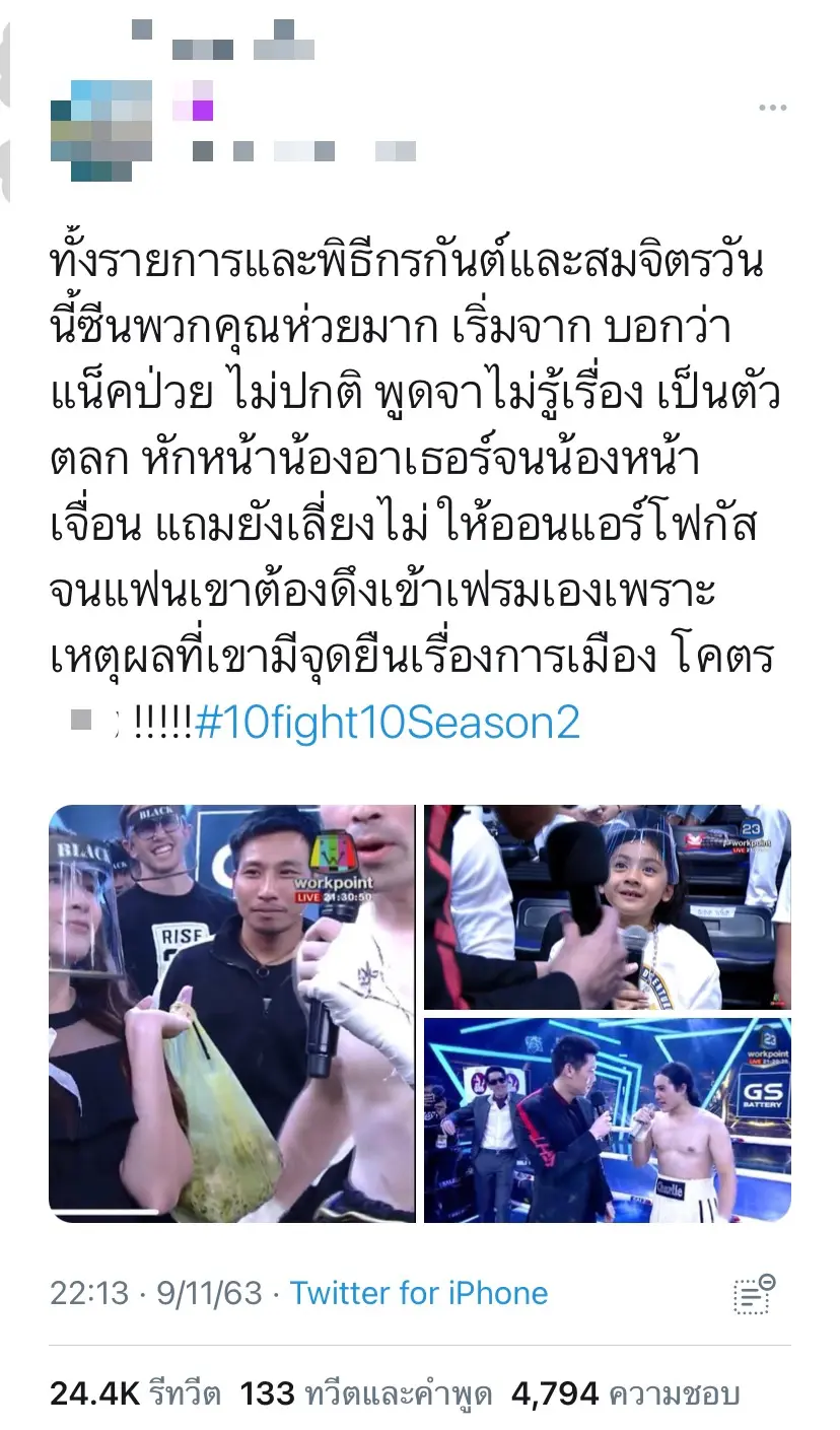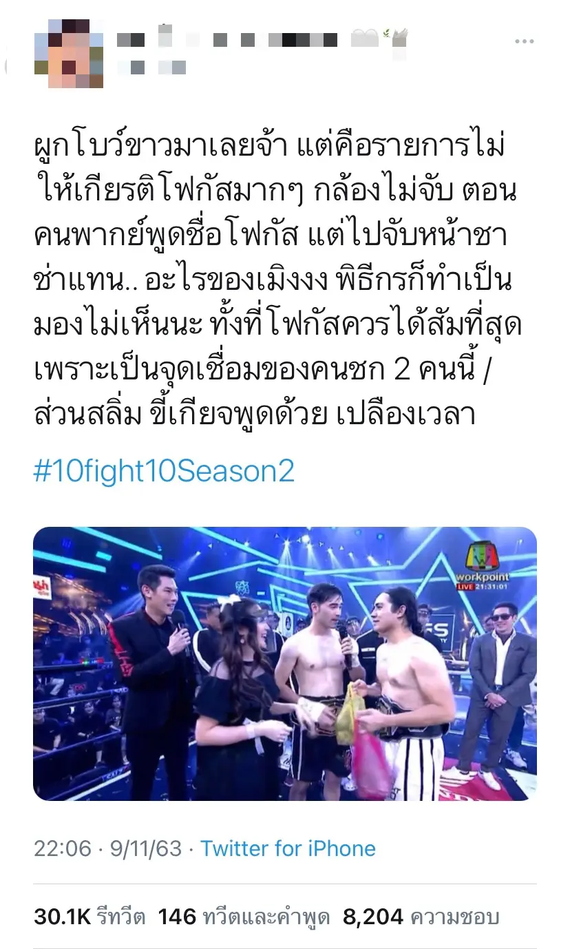 โดยในโลกออนไลน์ทวิตเตอร์ มองการแสดงจุดยืนของโฟกัส โดนเมินจากทางรายการ ไม่ให้เกียรติโฟกัส แอร์ไทม์ในการพูดถึงน้อย ทั้งที่เป็นอีกหนึ่งตัวละครและเป็นเรื่องราวที่ทำให้เกิดการชกขึ้นในวันนี้ และแถมยังเป็นแฟนของนักชกอีกด้วย และเมื่อขึ้นมาบนเวทีแล้ว ก็ยังถูกเมินจากทางพิธีกร และยังไม่มีการสัมภาษณ์เธอด้วย งานนี้เหล่าชาวเน็ตต่างก็รุมจวกเรื่องราวและร่วมกันออกมาปกป้อง และร่วมไปทัวร์ลงที่พิธีกร คือ กันต์ กันตถาวร อีกด้วย