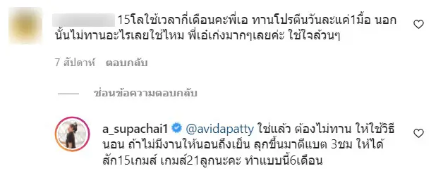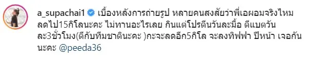 งานนี้เจ้าตัวยังแอบแชร์เคล็ดลับด้วยว่า ที่ลดน้ำหนักมาได้ถึง 15 กิโลฯ เพราะกินแต่โปรตีนวันละมื้อ และตีแบดฯ วันละ 3 ชั่วโมง ซึ่งจากข้อมูลบนเว็บไซต์ figureplayground ระบุว่า ‘การตีแบดจะใช้กล้ามเนื้อหลายส่วน ใน 1 ชั่วโมง สามารถเผาผลาญพลังงานได้ประมาณ 300-450 แคลอรี และถ้าเล่นเป็นประจำก็จะสามารถลดน้ำหนักได้ถึง 4 กิโลกรัมใน 1 เดือน’