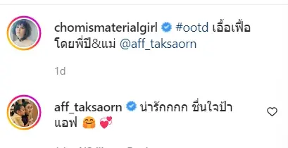 เรียกได้ว่างานนี้ทำเอาบรรดาแฟน ๆ แห่เข้ามาคอมเมนต์ชื่นชมทั้งคนทั้งชุดไปแบบเต็ม ๆ เลยทีเดียว อีกทั้ง แอฟ ทักษอร ยังเข้ามาคอมเมนต์สุดเอ็นดูอีกว่า น่ารักกกก ชื่นใจป้าแอฟ