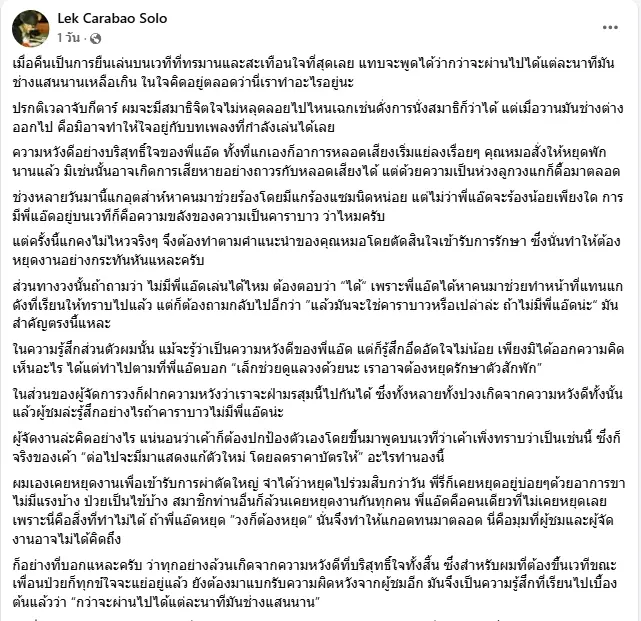 เหตุการณ์ดังกล่าวทำให้ “เล็ก คาราบาว”ออกมาโพสต์ข้อความผ่านเฟซบุ๊ก Lek Carabao Solo และต้องทำหน้าที่ขึ้นแสดงบนเวทีโดยไม่มีแอ๊ดเป็นครั้งแรก ซึ่งเจ้าตัวยอมรับว่าเป็นประสบการณ์ที่ยากที่สุดตั้งแต่เล่นดนตรีมา เพราะตลอดหลายสิบปีที่ผ่านมา ภาพของคาราบาวไม่เคยขาดผู้นำอย่างแอ๊ด คาราบาว ที่เป็นทั้งเสียงร้องหลัก สัญลักษณ์ และจิตวิญญาณของวง