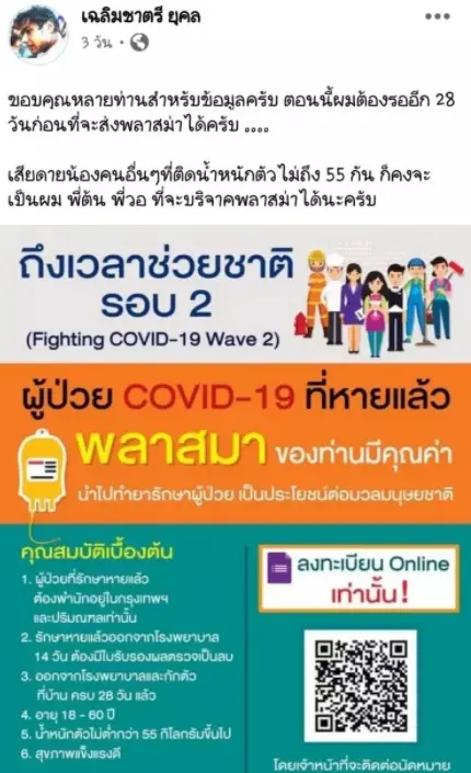 ต่อมา ได้มีการแชร์โพสต์เกี่ยวกับการลงทะเบียนบริจาคพลาสม่า พร้อมระบุข้อความว่า “ขอบคุณหลายท่านสำหรับข้อมูลครับ ตอนนี้ผมต้องรออีก 28 วันก่อนที่จะส่งพลาสมาได้ครับ เสียดายน้องคนอื่นๆที่ติด น้ำหนักตัวไม่ถึง 55 กัน ก็คงจะเป็นผม พี่ต้น พี่วอ ที่จะบริจาคพลาสมาได้นะครับ”