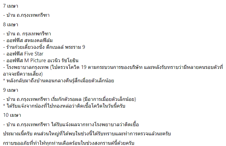 - บ้าน ถ. กรุงเทพกรีฑา (ได้ฝึกการแสดงกับผู้ติดเชื้อที่ไปเที่ยวทองหล่อมา ในวันที่ 2 มีการสัมผัสตัวระหว่างออกกำลังกาย สันนิษฐานว่าติดเชื้อในวันนี้ครับ)