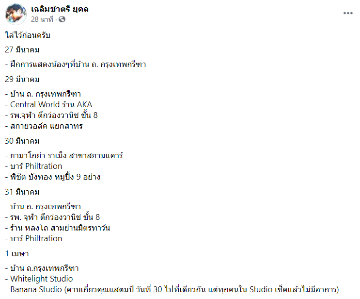 - Banana Studio (คาบเกี่ยวคุณแสตมป์ วันที่ 30 ไปที่เดียวกัน แต่ทุกคนใน Studio เช็คแล้วไม่มีอาการ)