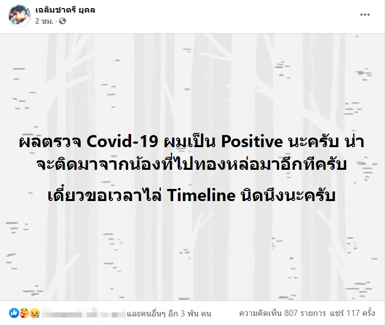 โดยรายละเอียดโพสต์ คือ “ผลตรวจ Covid-19 ผมเป็น Positive นะครับ น่าจะติดมาจากน้องที่ไปทองหล่อมาอีกทีครับ เดี๋ยวขอเวลาไล่ Timeline นิดนึงนะครับ”