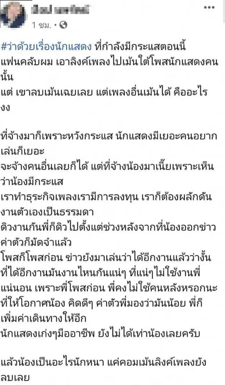 ซึ่งข้อความที่พาดพิงถึง เอ๋ มิรา นั้น ระบุว่า #ว่าด้วยเรื่องนักแสดง ที่กำลังมีกระแสตอนนี้แฟนคลับผม เอาลิงค์เพลงไปเม้นใต้โพสต์นักแสดงคนนั้น แต่เขาลบเม้นเฉยเลย แต่เพลงอื่นเม้นได้ คืออะไรงง ที่จ้างมาก็เพราะหวังกระแส นักแสดงมีเยอะ คนอยากเล่นก็เยอะจะจ้างคนอื่นเลยก็ได้ แต่ที่จ้างน้องมาเนี้ยเพราะเห็นว่าน้องมีกระแส เราทำธุรกิจเพลงเรามีการลงทุน เราก็ต้องผลักดัน งานตัวเองเป็นธรรมดา ดิวงานกันพี่ก็ดิวไปตั้งแต่ช่วงหลังจากที่น้องออกข่าว ค่าตัวก็มัดจำแล้ว โพสต์ก็โพสต์ก่อน ข่าวยังมาเล่นว่าได้อีกงานแล้วว่างั้น ที่ได้อีกงานมันงานไหนกันแน่ๆ ที่แน่ๆไม่ใช่งานพี่แน่นอน เพราะพี่โพสต์ก่อน พี่คงไม่ใช้คนหลังหรอกนะที่ให้โอกาสน้อง คิดดีๆ ค่าตัวพี่มองว่ามันน้อย พี่ก็เพิ่มค่าเดินทางให้อีกนักแสดงเก่งๆมืออาชีพ ยังไม่ได้เท่าน้องเลยครับแล้วน้องเป็นอะไรนักหนา แค่คอมเม้นลิงค์เพลงยังลบเลย