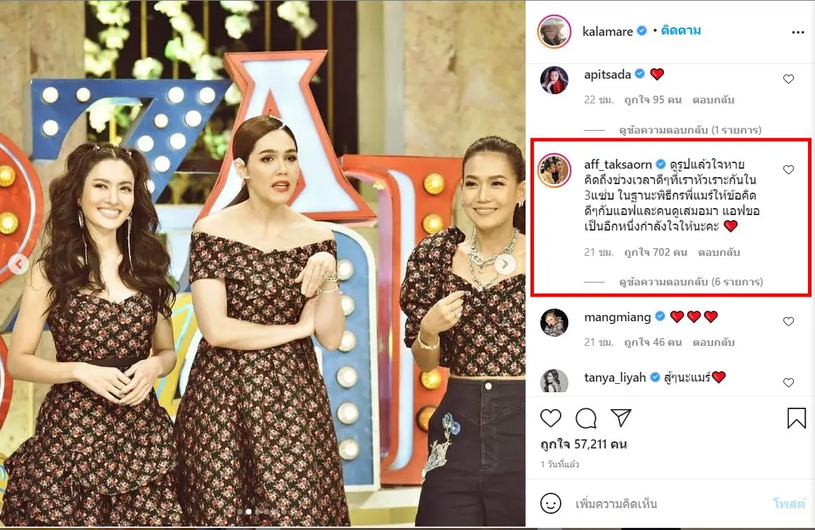ทั้งนี้ หนึ่งในพิธีกรร่วมรายการแอฟ ทักษอร ได้เข้าไปคอมเมนต์ในโพสต์ที่กาละแมร์ ได้โพสต์ยุติการทำหน้าที่ ว่า”ดูรูปแล้วใจหาย คิดถึงช่วงเวลาดีๆที่เราหัวเราะกันใน 3แซ่บ ในฐานะพิธีกรพี่แมร์ให้ข้อคิดดีๆกับแอฟและคนดูเสมอมา แอฟขอเป็นอีกหนึ่งกำลังใจให้นะคะ”