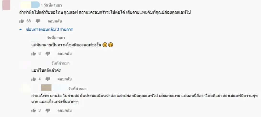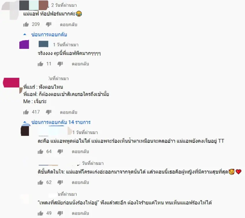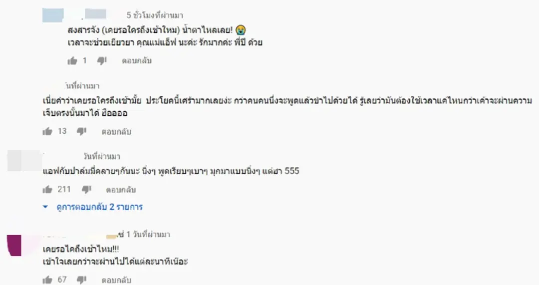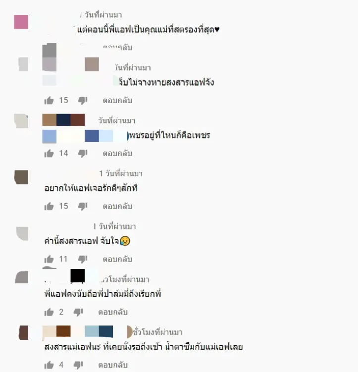 งานนี้ทำเอาบรรดาแฟนคลับไม่อยู่เฉย กระหน่ำคอมเมนต์โอบกอดแม่แอฟกันยกใหญ่ เพราะ ถึงแม้จะพูดแบบติดตลก แต่พอฟังลึกๆแล้ว มันก็ เจ็บ จุกอก ไม่น้อย