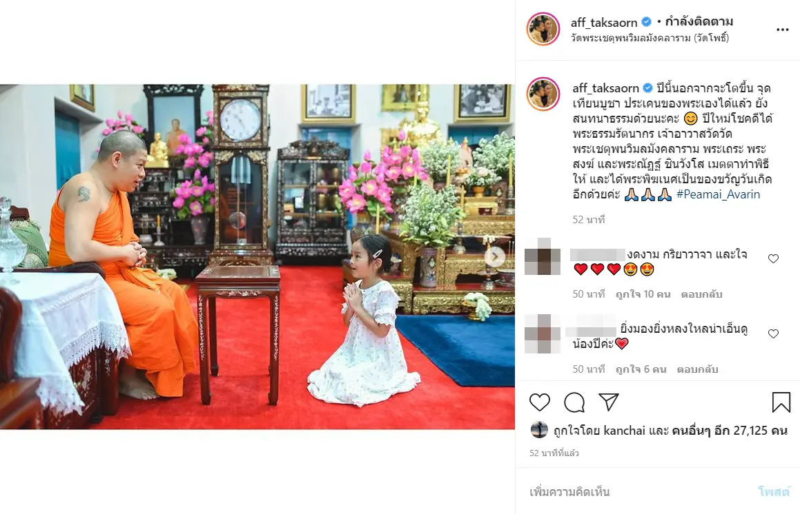 ซึ่งจกเซ็ทรูปที่แม่แอฟได้ลงในอินสตาแกรมส่วนตัว น้องปีใหม่เรียกได้ว่าถอดแบบคุณแม่มาไม่มีผิดเพี้ยน ทั้งอาการสำรวมเมื่ออยู่หน้าพระสงฆ์ ทั้งกล้าสนทนาธรรมแบบฉะฉาน จนแฟนๆถึงกับพากันคอมเมนต์ชื่นชมว่า ‘งดงาม กริยาวาจา และใจ ❤️❤️❤️??’, ‘ยิ่งมองยิ่งหลงใหลน่าเอ็นดูน้องปีค่ะ?’, ‘????????งดงามได้แม่????’, ‘น่ารัก งดงามจังเลยค่ะน้องปี หลงรัก?❤️’