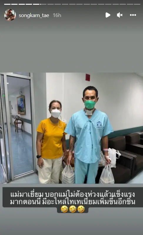 “ICU มาเจ็ดวันได้เวลากลับมาดูแลสุขภาพครับ” และยังโพสต์ภาพกับคุณแม่พร้อมแคปชันว่า “แม่มาเยี่ยม บอกแม่ไม่ต้องห่วงแล้วแข็งแรงมากตอนนี้ มีอะไหล่ไทเทเนียมเพิ่มขึ้นอีกชิ้น”