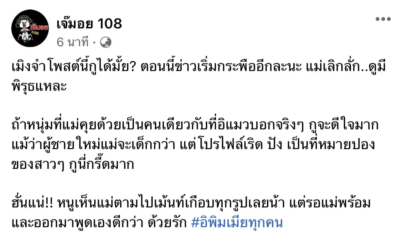เจ๊มอย108 ออกมาโพสต์ใหม่ ขยายใจความเดิมหลังใช่ปริศนาว่าแม่ แอบมีหนุ่มอายุน้อยเข้ามาคุย งานนี้ขาเผือกถ่างตารอ ใช่คนนี้หรือไม่