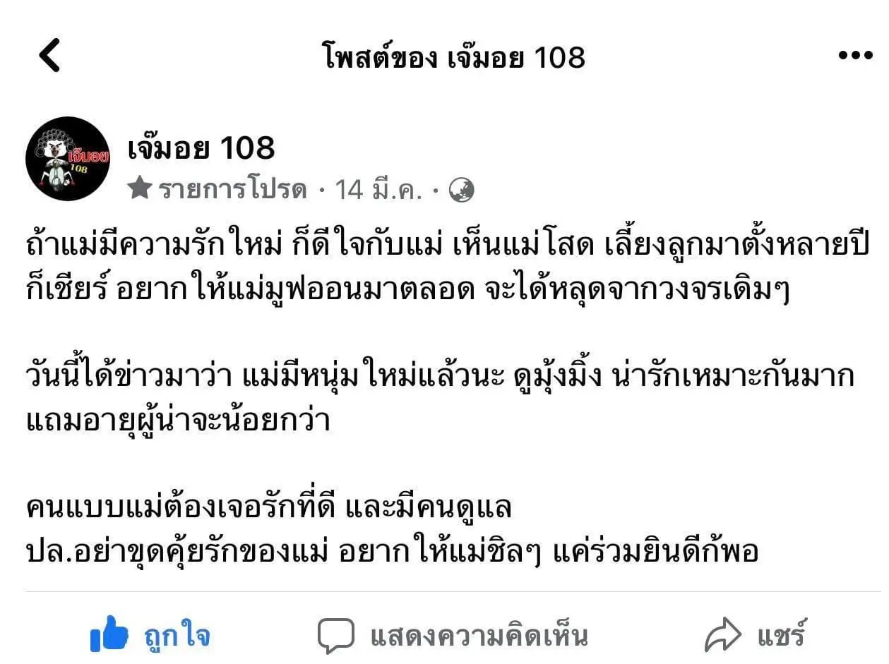 ถ้าใครยังตามกันอยู่ก่อนหน้านี้เพจดังเจ๊มอย108 ได้ออกมาโพสต์ว่า ถ้าแม่มีความรักใหม่ ก็ดีใจกับแม่ เห็นแม่โสด เลี้ยงลูกมาตั้งหลายปี ก็เชียร์ อยากให้แม่มูฟออนมาตลอด จะได้หลุดจากวงจรเดิมๆ วันนี้ได้ข่าวมาว่า แม่มีหนุ่มใหม่แล้วนะ ดูมุ้งมิ้ง น่ารักเหมาะกันมาก แถมอายุผู้น่าจะน้อยกว่า คนแบบแม่ต้องเจอรักที่ดี และมีคนดูแล ปล.อย่าขุดคุ้ยรักของแม่ อยากให้แม่ชิลๆ แค่ร่วมยินดีก็พอ