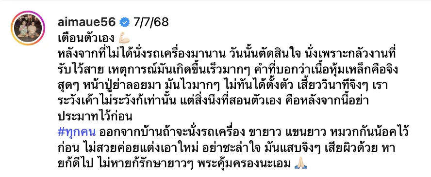 แม้จะเป็นอุบัติเหตุที่ไม่มีใครอยากให้เกิดขึ้น แต่เรื่องนี้ก็ถือเป็นบทเรียนสำคัญที่เอมอยากแชร์ให้ทุกคนตระหนักถึงความปลอดภัย และไม่ประมาทในการเดินทาง