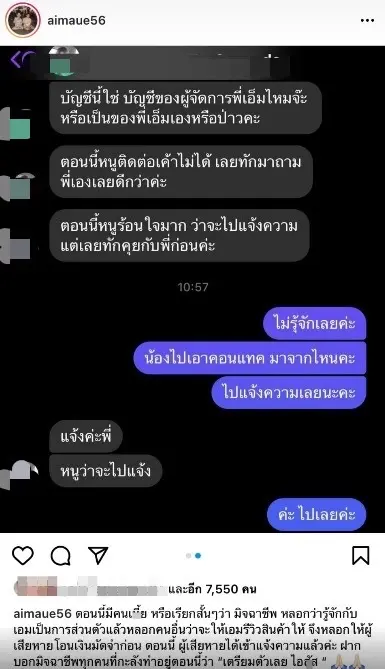 ทั้งนี้เจ้าตัวได้ออกมาแจ้งข่าวผ่าน Instagram ส่วนตัวถึงมิจฉาชีพดังกล่าวไปว่า “ตอนนี้มีคนเหี้* หรือเรียกสั้นๆว่า มิจฉาชีพ หลอกว่ารู้จักกับเอมเป็นการส่วนตัวแล้วหลอกคนอื่นว่าจะให้เอมรีวิวสินค้าให้ จึงหลอกให้ผู้เสียหายโอนเงินมัดจำก่อน ตอนนี้ ผู้เสียหายได้เข้าแจ้งความแล้วค่ะ ฝากบอกมิจฉาชีพทุกคนที่กะลังทำอยู่ตอนนี้ว่า “เตรียมตัวเลย ไอสั*”