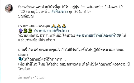 ซึ่งการถูกรางวัลครั้งนี้ เจ้าตัวก็จะนำเงินที่ได้ ไปสมทบทุนในการทำบุญต่อ โดยการสร้างพระพุทธเจ้าทันใจองค์ที่109 โดยตั้งใจจะสร้างให้เสร็จภายในเดือนเมษายนนี้ ซึ่งก็มีคนจำนวนมากเข้ามาร่วมอนุโมทนาบุญกับเจ้าตัวอีกด้วย