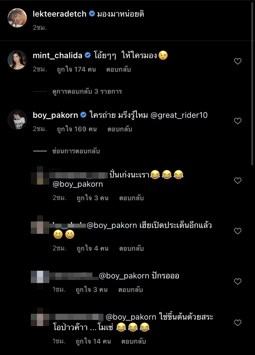 ที่ทำเอาหลายๆคนแตกตื่น ก็คือคอมเมนต์ของ บอย ปกรณ์ นักแสดงรุ่นพี่ในช่อง3 ที่เข้ามาคอมเมนต์กระตุกต่อมเผือกของชาวเน็ต โดยมาทิ้งบอมบ์เอาไว้ลูกใหญ่ ก่อนจะหายไปไม่ยอมมาบอกอะไรต่อ ทำเอาชาวเน็ตต่างก็ปักหมุดรอคำตอบจากบอยอยู่หลายคน