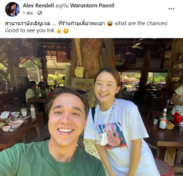 จิ้นหนักไม่มีแผ่วสำหรับคู่ของ อเล็กซ์ เรนเดลล์ และ อิ้งค์ วรันธร ที่ก่อนหน้านี้หลังจากที่อเล็กซ์ลงภาพคู่กับอิ้งค์เเค่ 1 ภาพ ก็เกิดกระเเส #ทวงคืนอิ้งค์จากอเล็กซ์ กันสนั่นโซเชียล ซึ่งถึงแม้ด้านฝ่ายชายจะออกมาบอกว่ามีเจ้าของเเล้ว เเละมองน้องอิ้งค์น่ารักเเละเอ็นดูเเบบพี่น้อง เเต่กระเเสความจิ้นก็ไม่เคยแผ่วลงจริงๆ ล่าสุดหนุ่ม อเล็กซ์ โพสต์ภาพคู่กับสาวอิ้งค์ พร้อมเเคปชั่นว่า “สาบานว่าบังเอิญเจอ …. ที่ร้านก๋วยเตี๋ยวพะเยา ? what are the chances! Good to see you Ink ??” งานนี้ชาวเน็ตเเละเเฟนคลับทั้งคู่ ก็เข้ามาคอมเมนต์แซวกับโมเมนต์ความบังเอ๊ญบังเอิญในครั้งนี้กันอย่างล้นหลาม