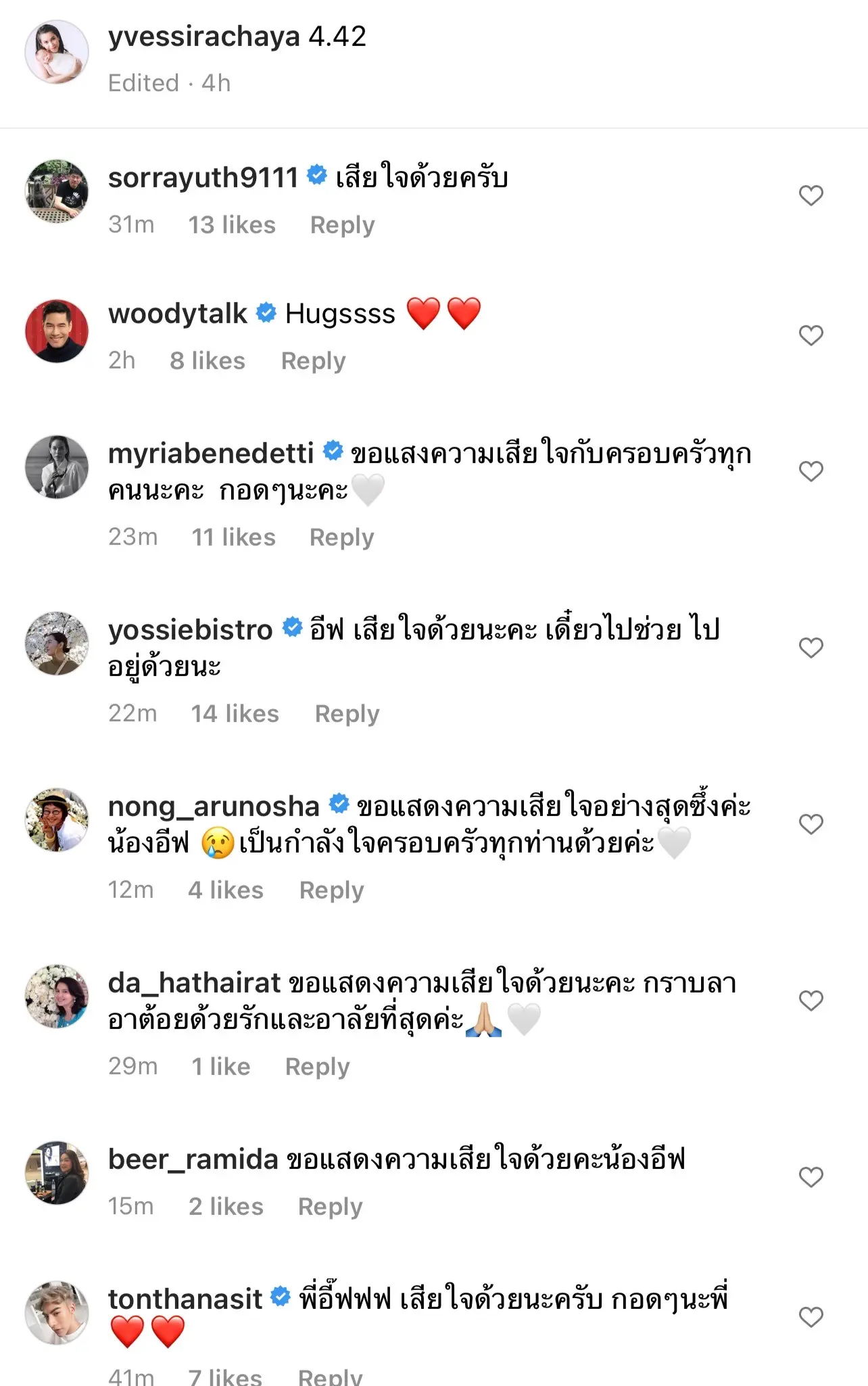 ขณะเดียวกันเหล่าบรรดาคนบันเทิงก็ได้เข้ามาร่วมแสดงความอาลัยถึง อาต้อย เศรษฐา กันในใต้โพสต์ข่าวการเสียชีวิตของลูกสาวคนเก่ง อีฟ พุทธิดา เป็นจำนวนมากเลยทีเดียว ไม่ว่าจะเป็น สรยุทธ สุทัศนะจินดา ,วู้ดดี้ ,นัท มีเรีย ,มิกค์ ทองระย้า และอื่นๆอีกมากมาย