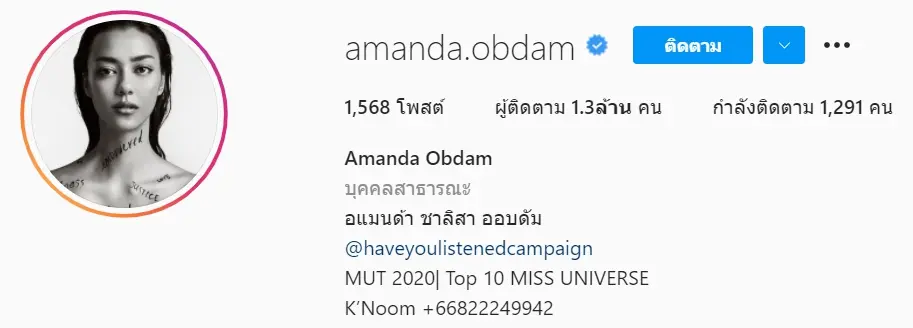 อแมนด้า เรียกได้ว่าเป็นประวัติศาสตร์ใหม่ของวงการนางงามไทยเลยก็ว่าได้ สำหรับ อแมนด้า ชาลิสา ออบดัม Miss Universe Thailand ที่หลังจากจบการประกวด ยอดฟอลโล่อินสตาแกรมก็พุ่งจากหลักแสน เป็นหลักล้านเลยทีเดียว
