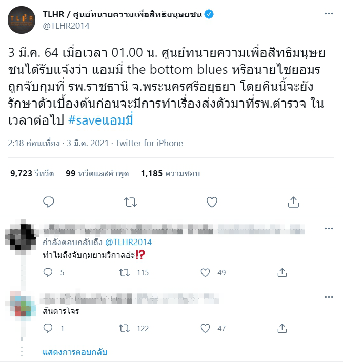 ก่อนจะได้มีอัปเดตจากแอคเคาท์ทวิตเตอร์ TLHR / ศูนย์ทนายความเพื่อสิทธิมนุษยชน ว่า “3 มี.ค. 64 เมื่อเวลา 01.00 น. ศูนย์ทนายความเพื่อสิทธิมนุษยชนได้รับแจ้งว่า นายไชยอมร ถูกจับกุมที่ รพ.ราชธานี จ.พระนครศรีอยุธยา โดยคืนนี้จะยังรักษาตัวเบื้องต้นก่อนจะมีการทำเรื่องส่งตัวมาที่รพ.ตำรวจ ในเวลาต่อไป #saveแอมมี่” เมื่อเวลาตี 2.18 น.