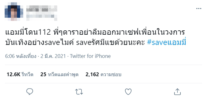 ดังกล่าว ในฐานะที่แอมมี่เป็นคนในวงการบันเทิง ได้มีคนออกมาทวิตว่า “แอมมี่โดน112 พี่ๆดาราอย่าลืมออกมาเซฟเพื่อนในวงการบันเทิงอย่างsaveไมค์ saveรัศมีแขด้วยนะคะ #saveแอมมี่”