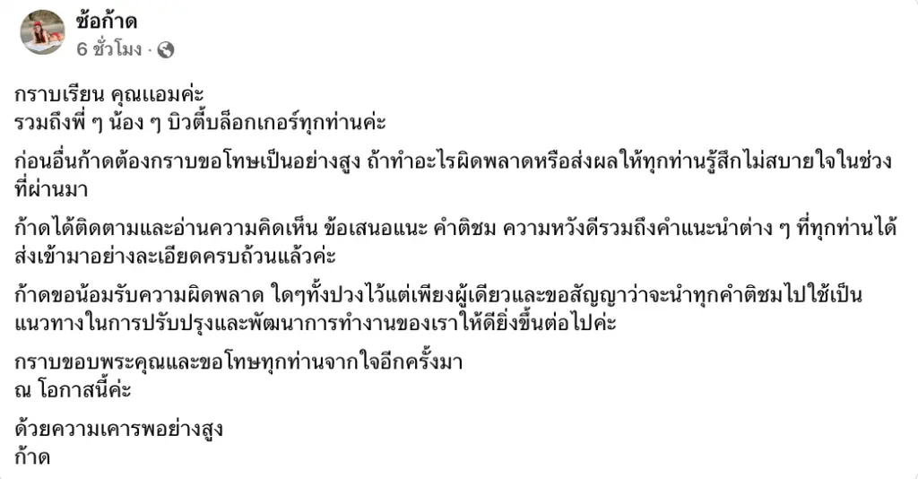 “ก้าดขอน้อมรับความผิดพลาดใด ๆ ทั้งปวงไว้แต่เพียงผู้เดียว และขอสัญญาว่าจะนำทุกคำติชมไปใช้เป็นแนวทางในการปรับปรุงและพัฒนาการทำงานของเราให้ดียิ่งขึ้นต่อไปค่ะ”