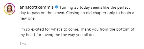 และนอกจากวันนี้จะเป็นวันที่แอนต้องส่งมอบตำแหน่งต่อไปแล้ว ยังตรงกับวันเกิดปีที่ 23 ของเจ้าตัวอีกด้วย งานนี้แอนเลยถือโอกาสนี้ ออกมาขอบคุณแฟน ๆ นางงามทุกคนที่คอยซัพพอร์ตและส่งกำลใจให้กับเจ้าตัวมาโดยมาตลอด