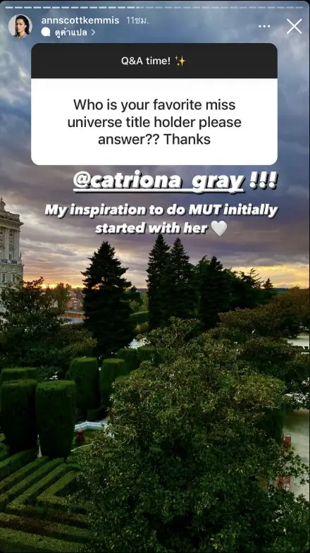 และในไอจีของแอนชิลีเองก็ได้มีการทำสตอรี่ Q&A กับแฟนๆที่คอยติดตามเจ้าตัวอยู่ โดยก็เป็นถามคำถามทั่วไปเกี่ยวกับตัวแอนเอง ซึ่งมีอยู่หนึ่งคำถามที่ถามเจ้าตัวถึงเรื่องของต้นแบบ Miss Universe ที่ชอบที่สุดคือใคร แอนชิลี ก็ตอบแฟนคลับทันทีว่า มี แคทรีโอน่า เกรย์ เป็นต้นแบบ การเริ่มประกวดนางงามในครั้งนี้ก็เพราะแคทเลยทีเดียว