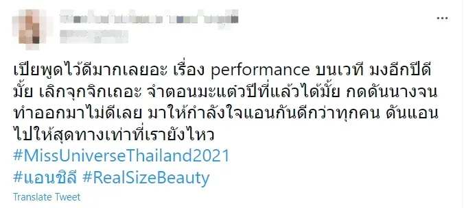 โดยในแท็กก็มีการออกมาแสดงความคิดเห็นต่างๆนานจากทั้ง 2 ฝ่าย ซึ่งก็มีส่วนหนึ่งบอกว่าตอนนี้ควรที่ให้กำลังใจตัวนางงามมากว่าที่จะมากดดันกันเอง จนอาจจะทำให้นางงามเสียสมาธิเหมือนนางงามจากประเทศอื่นๆก็ได้ พร้อมทั้งยกบทสัมภาษณ์ของ เปีย อลอนโซ วุลซ์บัค Miss Universe ปี2015 ที่ได้เคยพูดเอาไว้ว่า ให้เลิกบูลลี่นางงาม เลิกพูดเพ้อเจ้อว่า นางงามต้องทำได้มากกว่านี้ ลดนั้น เพิ่มนี้ ไม่เลย นางงามมายืนตรงนี้เพื่อเป็นตัวแทนของประเทศ มาทำเพื่อประเทศ ยืนอยู่บนเวทีเพื่อประเทศ จึงต้องให้กำลังและให้ทุกความมั่นใจกับนางงามในการแข่งขัน