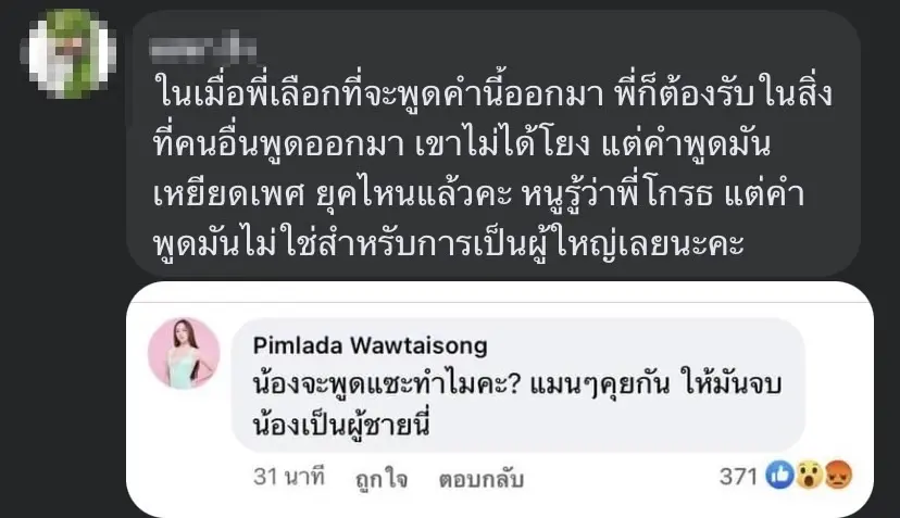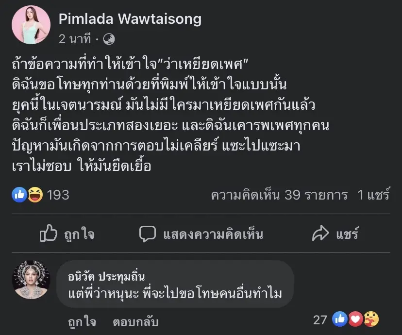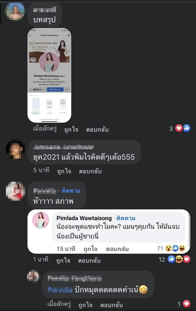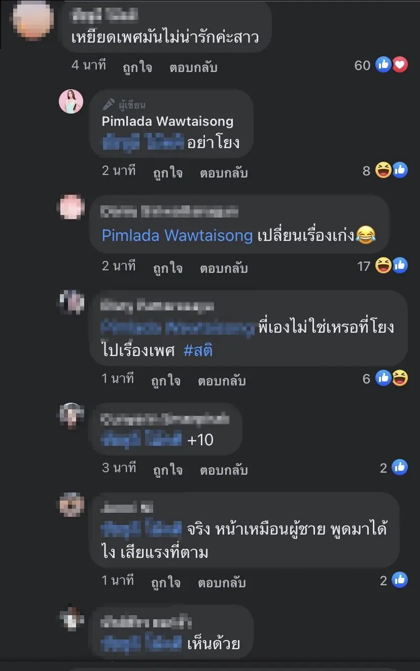 ไม่เพียงเท่านี้เหล่าชาวเน็ตก็ได้มีการแห่คอมเมนต์ไปยัง สอดอ พร้อมกับวิพากย์วิจารณ์ต่อคำพูดดังกล่าวกันยกใหญ่ จน สอดอ ถึงขั้นออกมาโพสต์อีกครั้งว่า ถ้าข้อความที่ทำให้เข้าใจว่า “เหยียดเพศ” ดิฉันขอโทษทุกท่านด้วยที่พิมพ์ให้เข้าใจแบบนั้น ยุคนี้ในเจตนารมณ์ มันไม่มีใครมาเหยียดเพศกันแล้ว ดิฉันก็เพื่อนประเภทสองเยอะ และดิฉันเคารพเพศทุกคน ปัญหามันเกิดจากการตอบไม่เคลียร์ แซะไปแซะมา เราไม่ชอบ ให้มันยืดเยื้อ โดยมี นารา เข้ามาไปคอมเมนต์ตอบกลับใต้โพสต์ดังกล่าวว่า แต่พี่ว่าหนูนะ พี่จะไปขอโทษคนอื่นทำไม