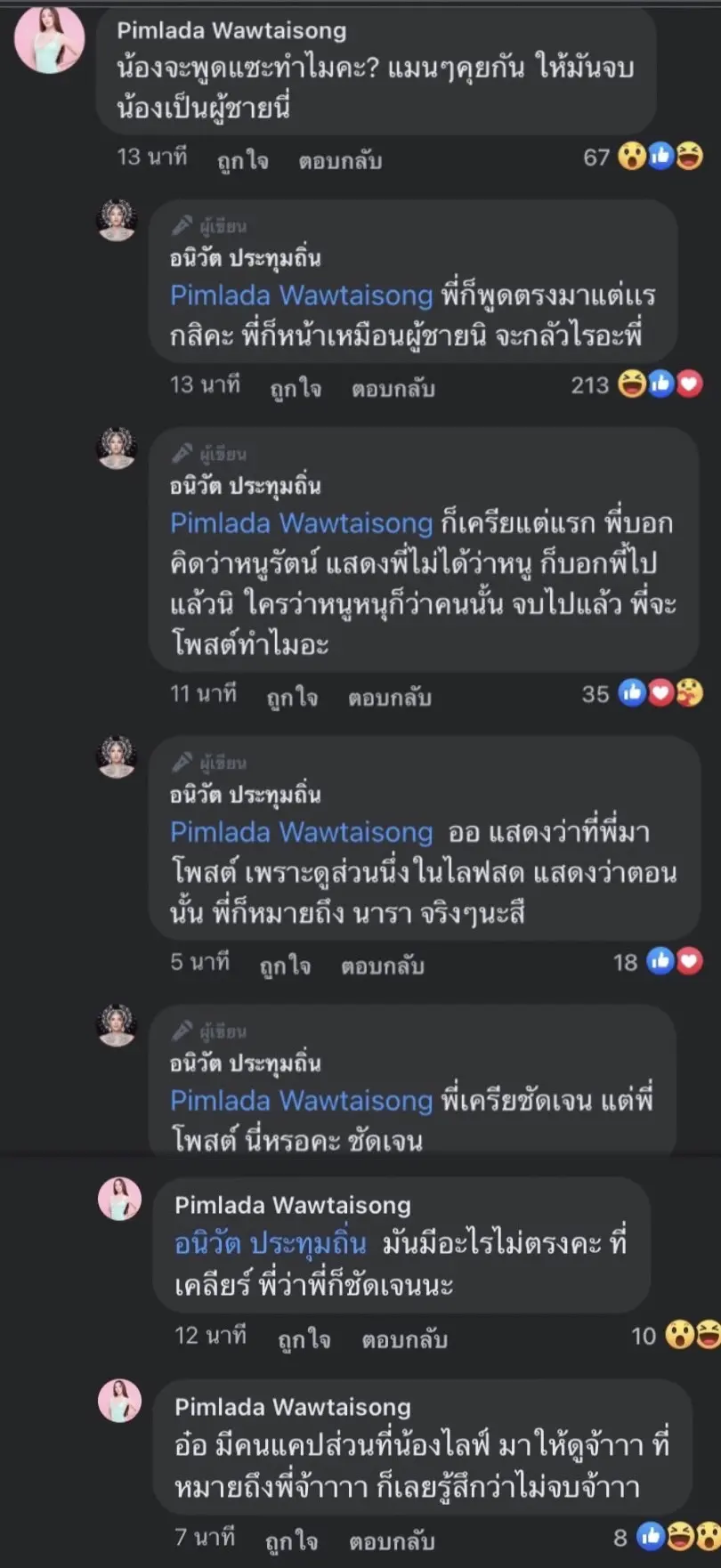 ซึ่งด้าน นารา ก็ได้มีการโพสต์ข้อความผ่านทางเฟซบุ๊ก อนิวัต ประทุมถิ่น ด้วยเช่นกันว่า คำพูดคำจาดูแรงสุดๆ เอาตรงๆป้ะ ว่าหนูทำไม ถึงไม่พูดอะ บอกหนูรัตน์ทำไมอะ และมาพูดแรงๆ มาพูดรวยคูยทำไมจ้ะ