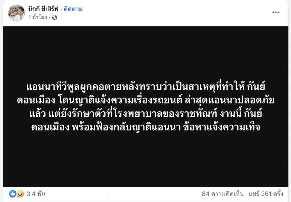 “แอนนา ทีวีพูล” พยายามจบชีวิต หลังถูกโยงเป็นต้นเหตุให้ “กันย์ ดอนเมือง” โดนญาติแจ้งความ