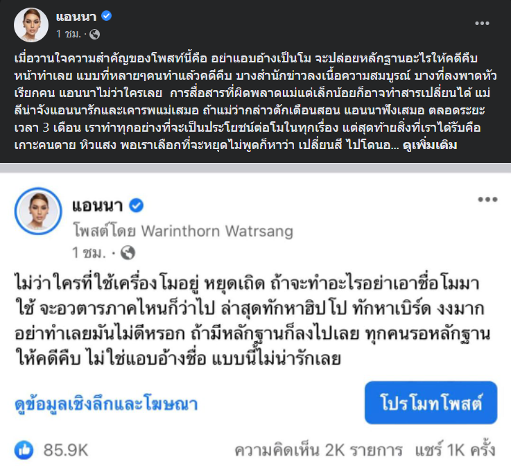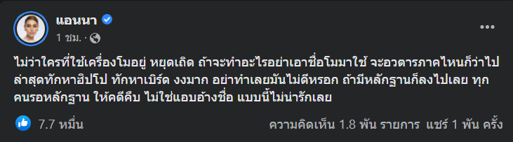 แอนนา ชี้แจงดราม่า หยุดแอบอ้างชื่อ แตงโม นิดา ยัน ใจความสำคัญคือ อย่าแอบอ้างเป็นโม แต่หากจะปล่อยหลักฐานอะไรให้คดีคืบหน้าทำเลย
