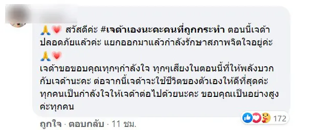 โดยล่าสุดสาวประเภทสองคนดังกล่าวก็ได้ออกมาอัปเดตความเคลื่อนไหวของตนเอง พร้อมขอบคุณทุก ๆ กำลังใจที่มอบให้ ‘สวัสดีค่ะ เจด้าเองนะคะ คนที่ถูกกระทำ ตอนนี้เจด้าปลอดภัยแล้วค่ะ แยกออกมาแล้วกำลังรักษาสภาพจิตใจอยู่ค่ะ เจด้าขอขอบคุณทุก ๆ กำลังใจ ทุก ๆ เสียงในตอนนี้ที่ให้พลังบวกกับเจด้านะคะ ต่อจากนี้เจด้าจะใช้ชีวิตของตัวเองให้ดีที่สุดค่ะ ทุกคนเป็นกำลังใจให้เจด้าต่อไปด้วยนะคะ ขอบคุณเป็นอย่างสูงค่ะทุกคน’