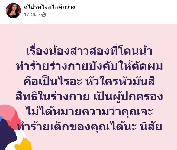 หรือแม้แต่กระทั่ง สไปรท์ พัชร์ธีรัตน์ อินฟลูเอนเซอร์และยูทูบเบอร์สายนางงาม ที่ได้ออกมาโพสต์แสดงความคิดเห็นเกี่ยวกับเรื่องนี้ว่า ‘เรื่องน้องสาวสองที่โดนน้าทำร้ายร่างกายบังคับให้ตัดผม คือเป็นไรอ่ะ หัวใครหัวมันสิ สิทธิในร่างกาย เป็นผู้ปกครองไม่ได้หมายความว่าคุณจะทำร้ายเด็กของคุณได้นะ นิสัย’