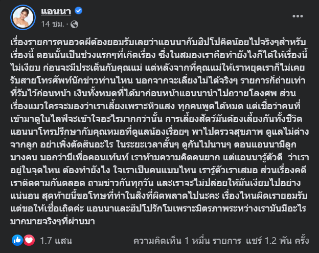 ‘ส่วนเรื่องคดี เราติดตามกันตลอด ถามข่าวกันทุกวัน และเราจะไม่ปล่อยให้มันเงียบไปอย่างแน่นอน สุดท้ายนี้ขอโทษที่ทำในสิ่งที่ผิดพลาดไปนะคะ เรื่องไหนผิดเรายอมรับ แต่ขอให้เชื่อเถิดค่ะ แอนนาและฮิปโปรักโมเพราะมิตรภาพระหว่างเรามันมีอะไรมากมายจริง ๆ ที่ผ่านมา’