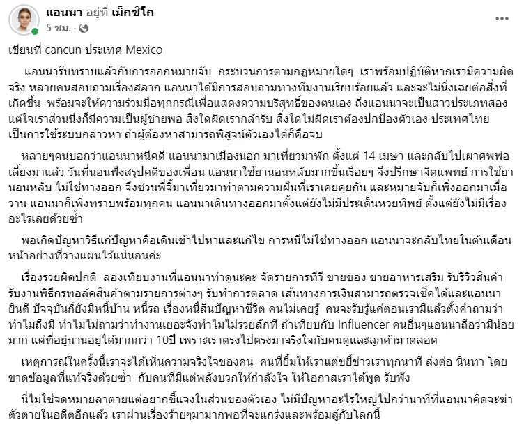 แอนนา เคลื่อนไหวโพสต์เฟซบุ๊กชี้แจงหลังมีหมายจับคดีหวยทิพย์ ตอนนี้อยู่ต่างประเทศกลับมาไทยเตรียมชี้แจงทุกประเด็น