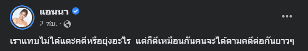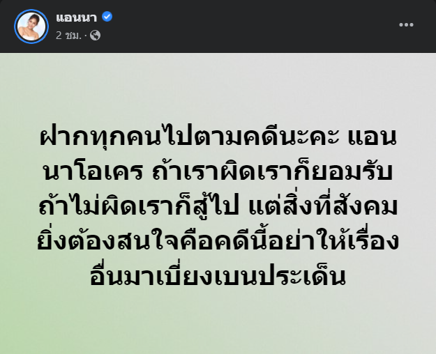 โพสต์ถัดมา ระบุว่า ‘ฝากทุกคนไปตามคดีนะคะ แอนนาโอเค ถ้าเราผิด เราก็ยอมรับผิด ถ้าไม่ผิดเราก็สู้ไป แต่สิ่งที่สังคมยิ่งต้องสนใจคือคดีนี้อย่าให้เรื่องอื่นมาเบี่ยงเบนประเด็น’